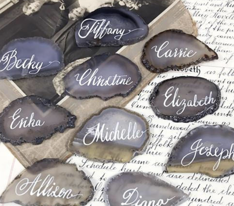 Elegant and timeless! These are sure to impress your guests. *Insider tip* Do you already have someone in your inner circle who is skilled at calligraphy? If so, head to your local Lowe’s or Home Depot and pick up some tile samples. Often times you can find these tiles in 12″ samples and break them apart to make individual place cards.